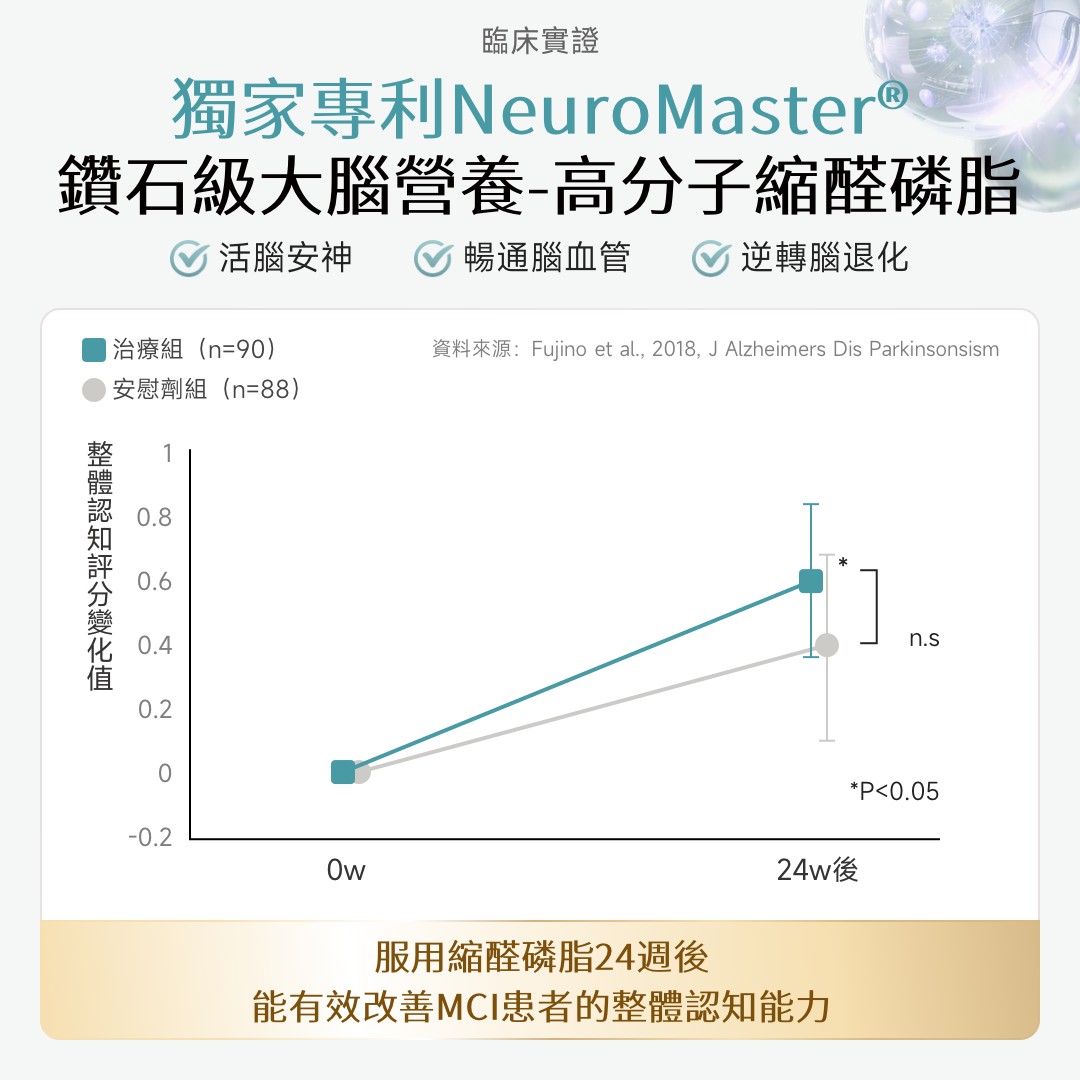 強效加固神經元結構,與 PS(磷脂醯絲氨酸)形成 「深層修復 + 長效守護」 的協同閉環,穩固修復成果、減少氧化損傷。臨床實證24 週改善輕度認知障礙患者的地點認知、注意力與運算能力,中度認知障礙控制率達高 88.8%。