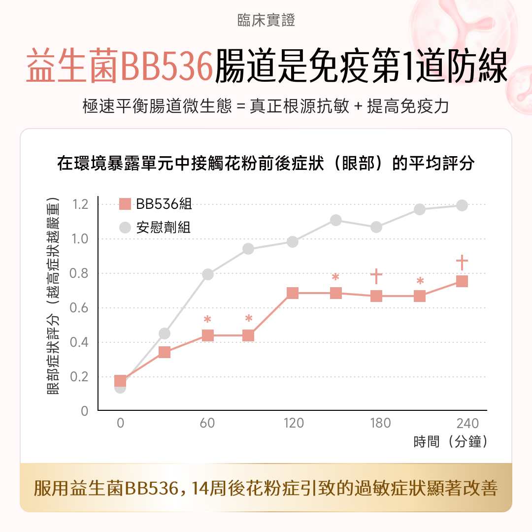 研究證實,服用益生菌BB536 14週後,花粉症導致的眼部過敏症狀顯著改善(p<0.005)。意大利IRCCS醫學研究亦顯示,BB536能有效減輕花粉引起的過敏性鼻炎(AR)症狀(p<0.005)。