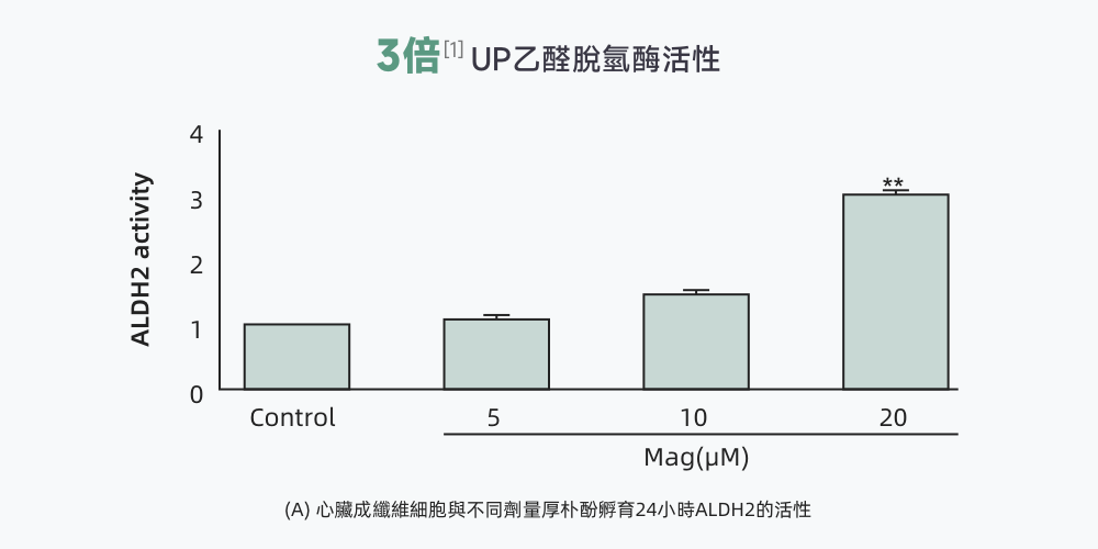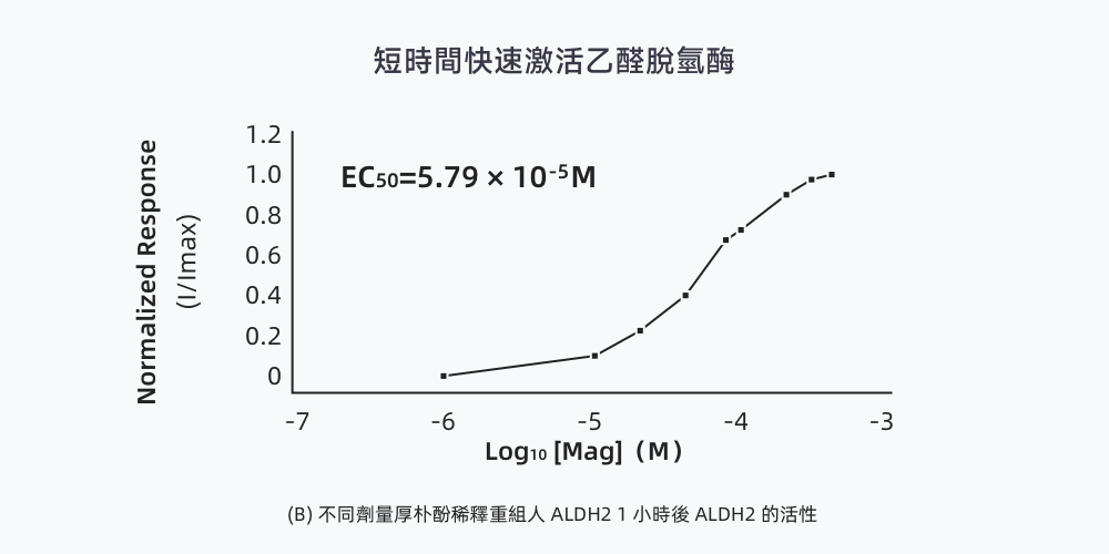 (A) 通過體外臨床實驗數據表明:20uM劑量的厚朴酚可以將乙醛脫氫酶的活性提高3倍;(B) 厚朴酚可在短時間內快速激活乙醛脫氫酶,且高劑量的厚朴酚對乙醛脫氫酶活性的激活能力更強。
