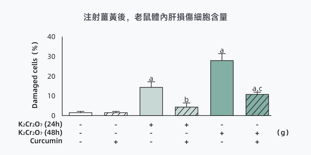 通過體外臨床實驗數據表明:注射薑黃素後,炎症因子表達下降,薑黃素抑制了肝臟內的炎症因子同時,肝細胞損傷顯著下降。