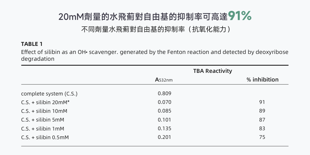 水飛薊對肝細胞修復和還原肝活力的能力提高了32倍,對肝臟健康發揮長效作用;20mM劑量的水飛蓟對自由基的抑制率可高達91%。