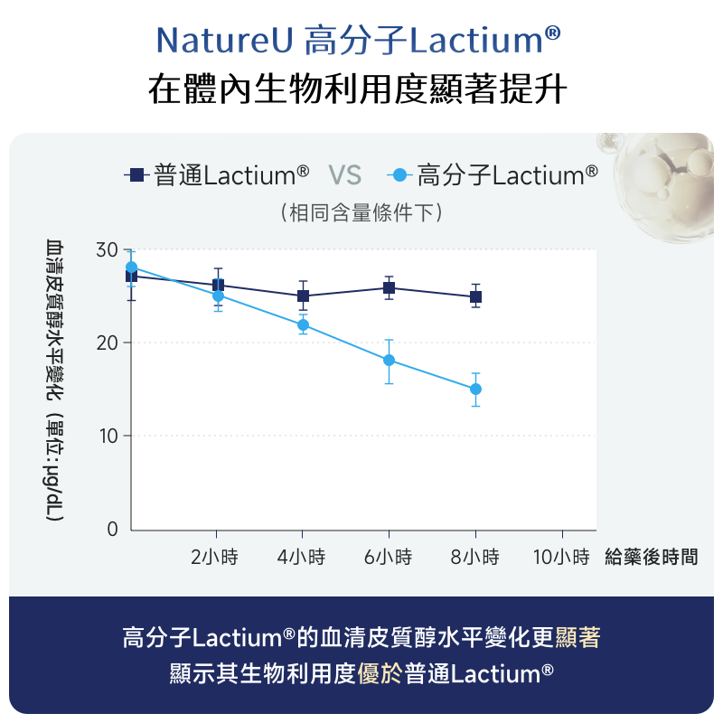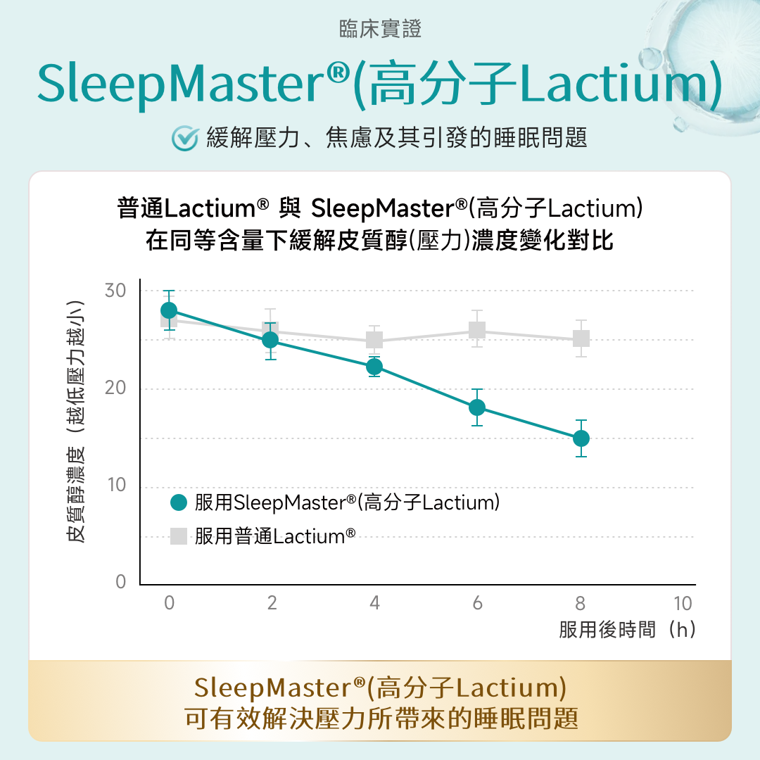 高分子Lactium®安撫神經,緩解壓力是普通Lactium® 的 2 倍,全面提升睡眠品質與精神狀態,助力優質睡眠養成。