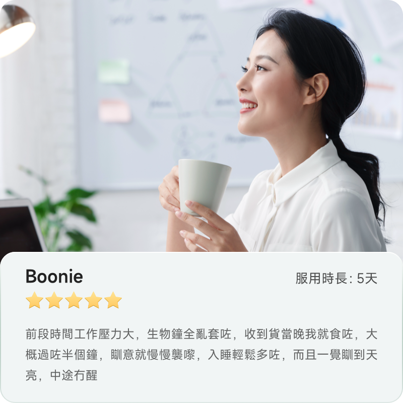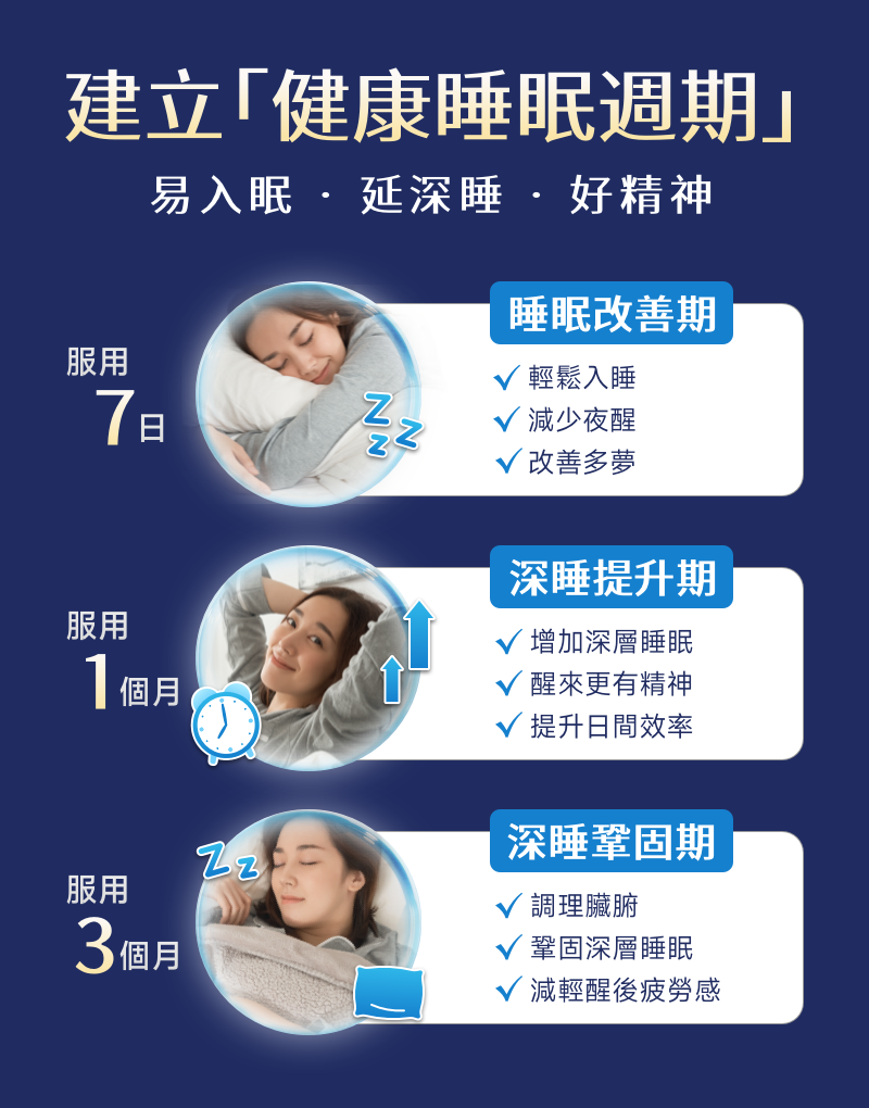 見效時間:多數用戶首次服用即可感受放鬆效果,持續使用 1-2 周可顯著改善睡眠質量。