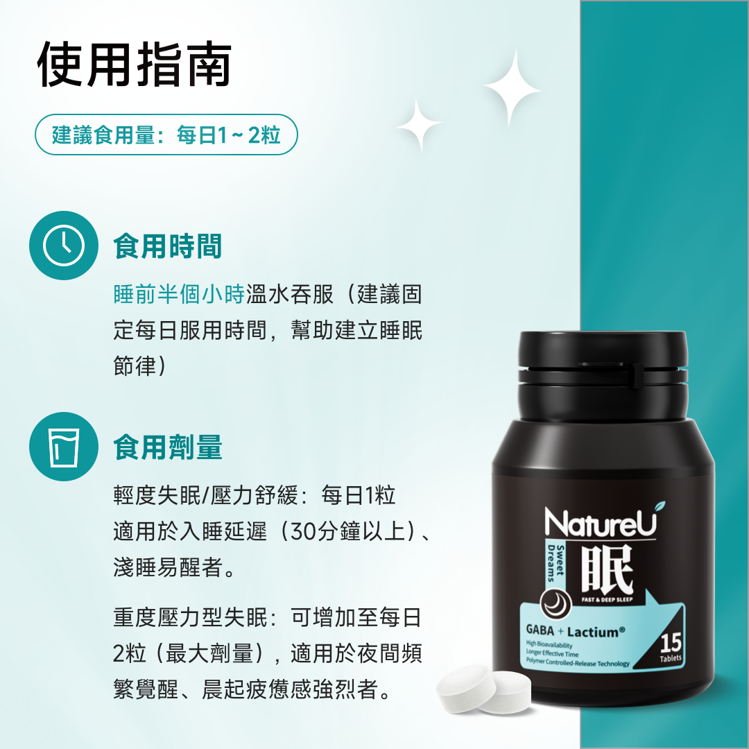不含褪黑素及任何安眠藥物成分,主要成分為天然來源的高分子 GABA 及 Lactium®,經國際認證為安全食品級原料,無依賴性,可長期服用。