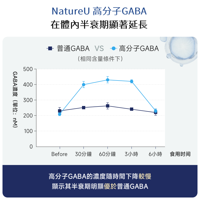 高分子 GABA 是通過獨家專利技術改良的 GABA 成分,相較於普通 GABA,其體內半衰期顯著延長,生物利用度提升 5-10 倍,能實現 6 小時持續起效,深度睡眠更穩定,夜晚起夜次數減少。