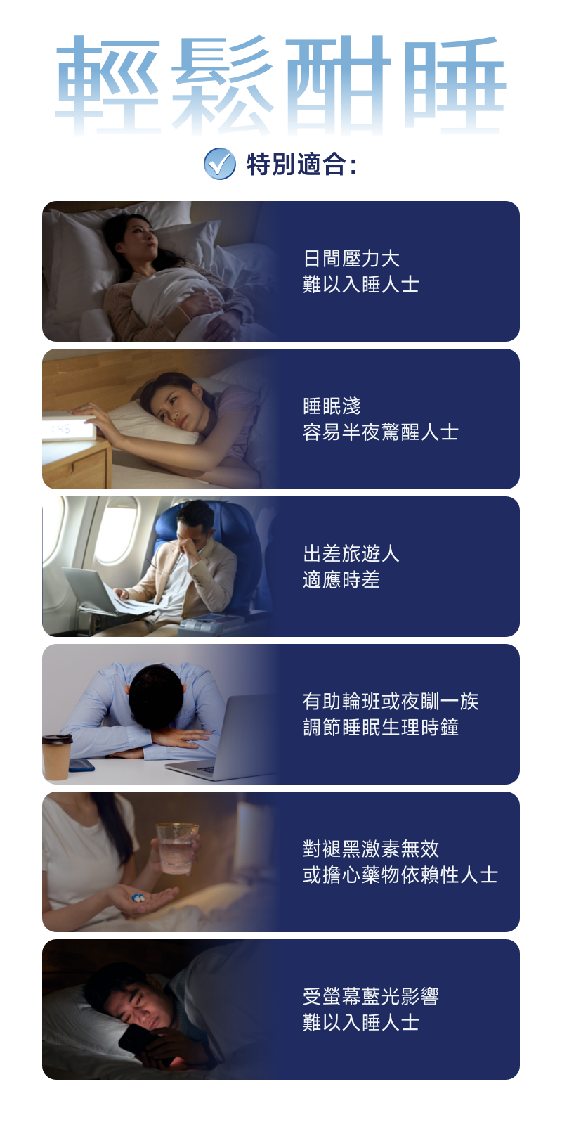 適合入睡困難、夜間易醒、深度睡眠不足、因壓力導致焦慮失眠,或作息不規律(如加班、時差)的人群。