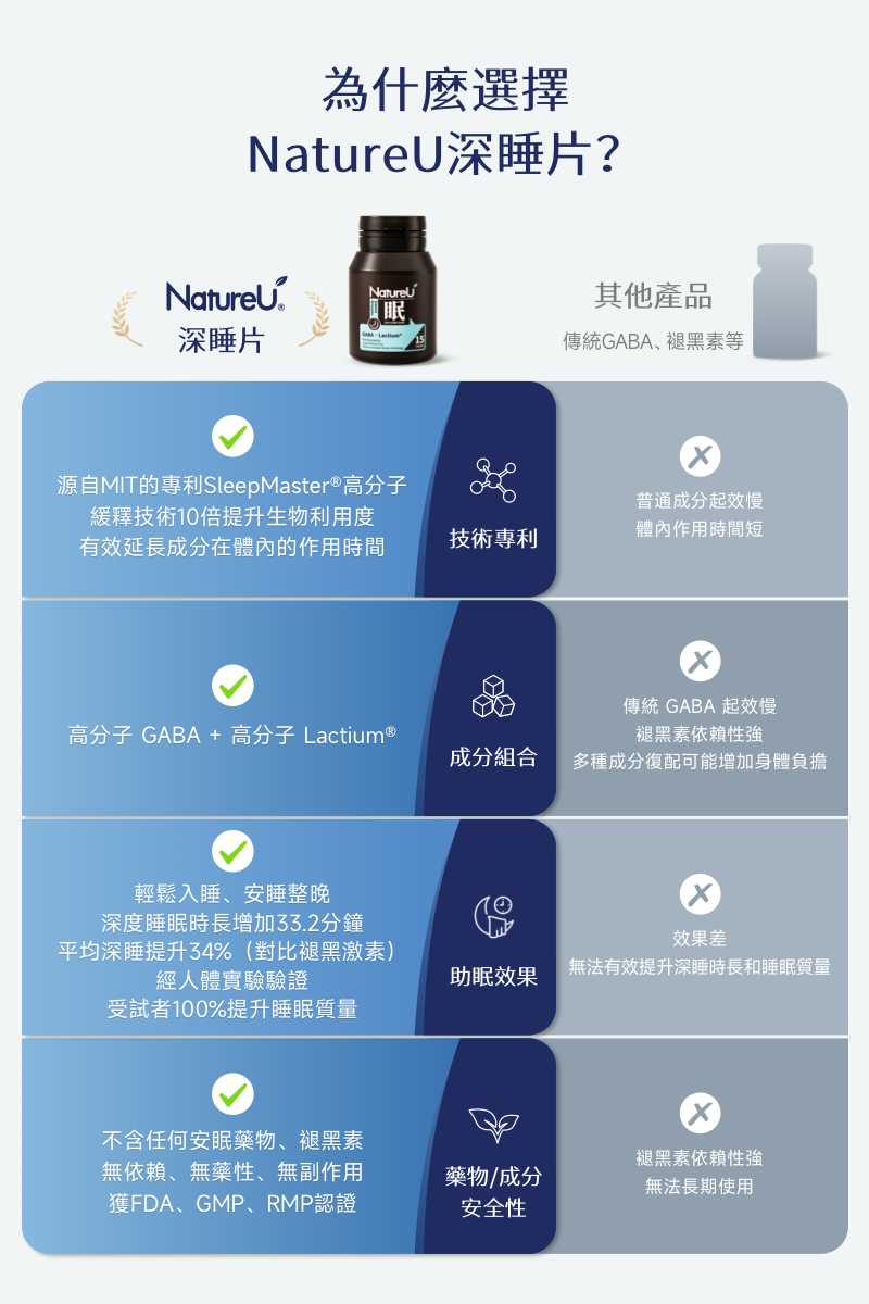 有無依賴性:不含激素或藥物成分,通過調節人體自然分泌的 GABA 神經遞質及降低皮質醇水平改善睡眠,經臨床試驗驗證無依賴性,可安全長期服用。